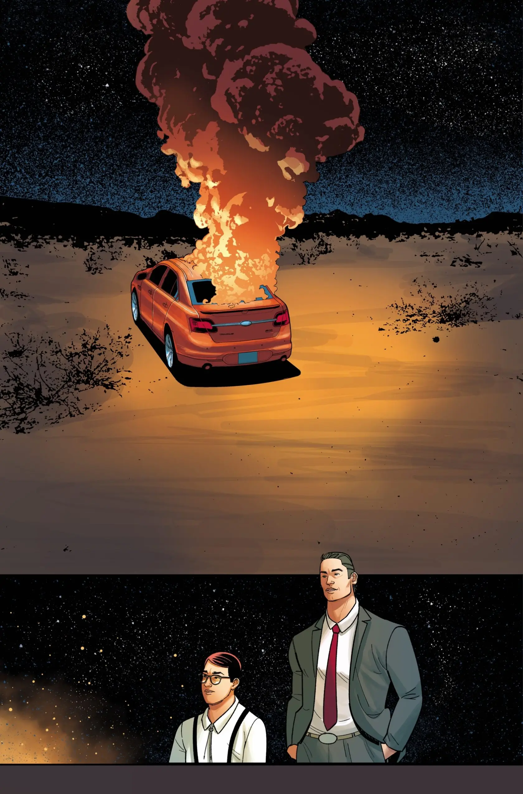 There’s a great splash page Felipe and Marco really nailed in the end of issue 2. Two characters are watching a car burning in the middle of the desert. I don’t want to spoil anything, but I love how the scene is set and plays out.